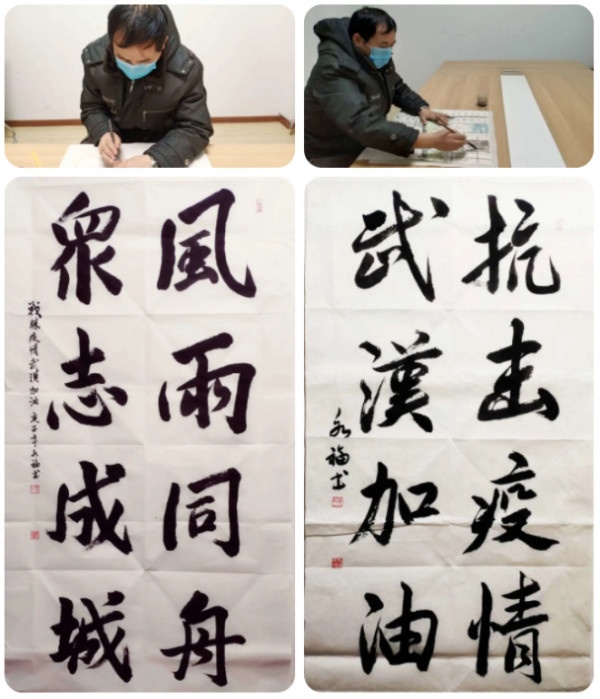 除了創(chuàng)作防疫宣傳畫冊(cè),李永福還揮毫潑墨,書(shū)寫“抗擊疫情,武漢加油”、“眾志成城,風(fēng)雨同舟”等文字,表達(dá)對(duì)武漢、對(duì)祖國(guó)的祝福。