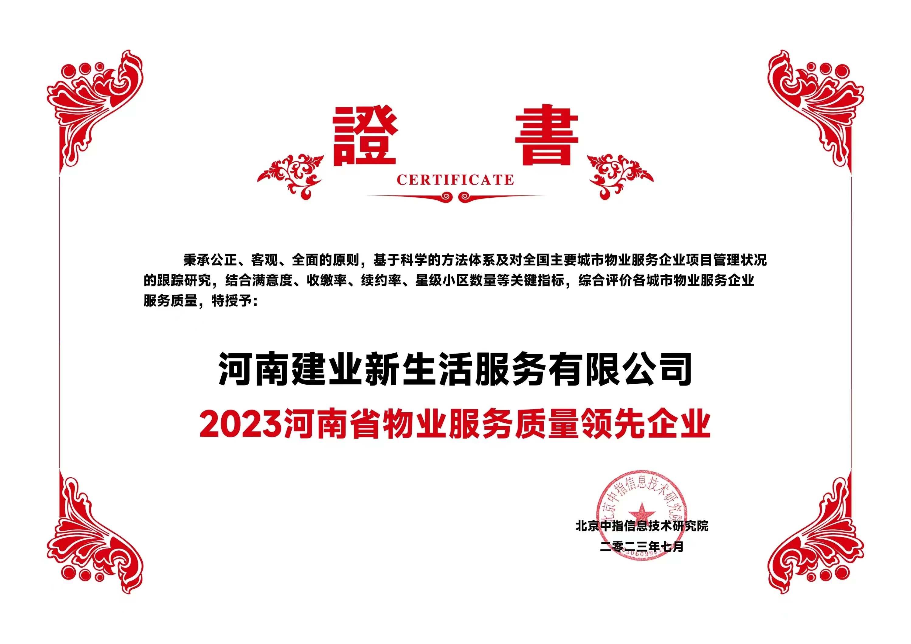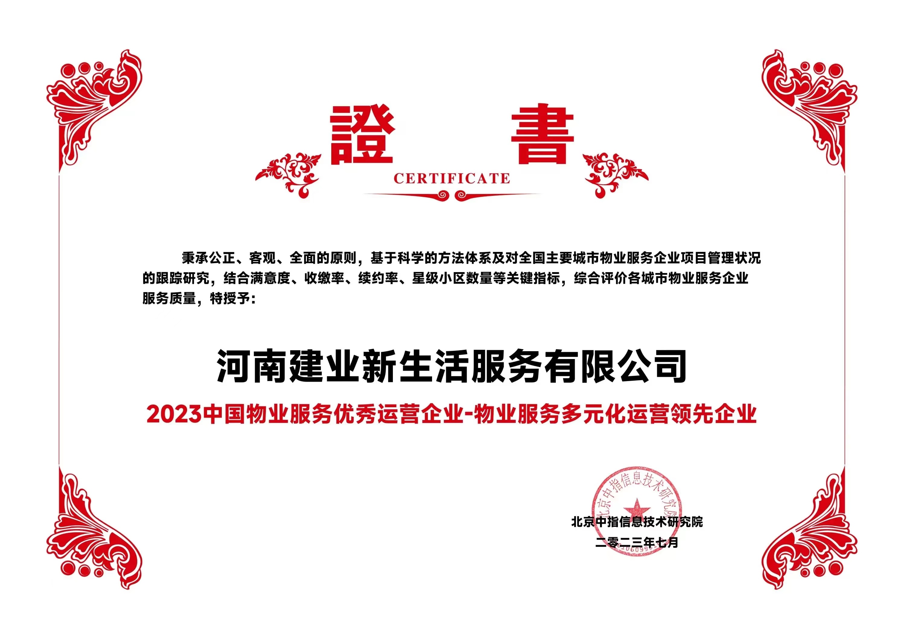 7月6日,在由北京中指信息研究院主辦的中房指數(shù)2023房產(chǎn)市場(chǎng)趨勢(shì)報(bào)告會(huì)上,建業(yè)新生活憑借卓越的運(yùn)營(yíng)能力和專(zhuān)業(yè)的服務(wù)水平,榮獲“2023 物業(yè)服務(wù)優(yōu)秀運(yùn)營(yíng)企業(yè)-物業(yè)服務(wù)多元化運(yùn)營(yíng)優(yōu)秀企業(yè)”“2023 河南省服務(wù)質(zhì)量領(lǐng)先企業(yè)”“2023鄭州市服務(wù)質(zhì)量領(lǐng)先企業(yè)”三項(xiàng)殊榮。